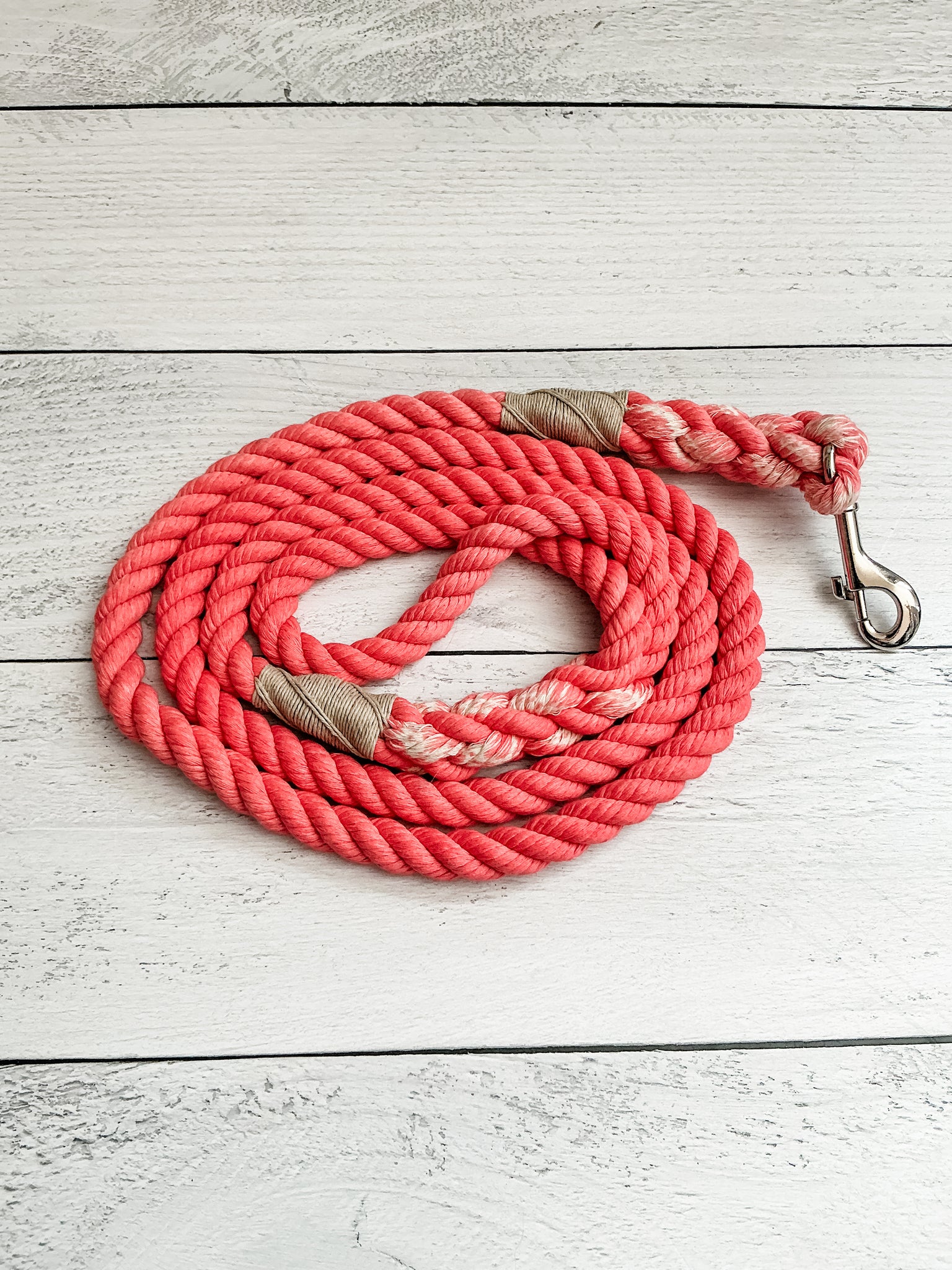 A 100% organic soft cotton rope dog leash in coral. Handcrafted and hand dyed for a one of a kind leash and lasting quality.